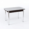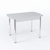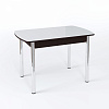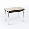 Столешница имеет размер 1 м 10 см, синхронно-раздвижной механизм “бабочка” позволяет увеличить ее еще на 30 см и увеличить количество посадочных мест. Материалы изготовления - ЛДСП, МДФ и закаленное стекло. В ассортименте варианты с цветным стеклом, с узором, с кожзамом, с фотопечатью и даже с искусственным камнем. Ножки могут быть гнутыми или прямыми, из хромированной стали или массива березы в одном из трех цветов - выбор комбинаций просто огромный.