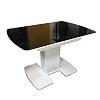 Недорогая функциональная и стильная модель.  Каркас стола изготовлен из ЛДСП, цвет белый или венге. Столешница из МДФ с закаленным стеклом, матовым или глянцевым на выбор. Имеет полуовальную форму, размер 110 см с возможностью увеличения еще на 30 см. Опирается на одну ножку, переходящую в две плоские опоры на полу.